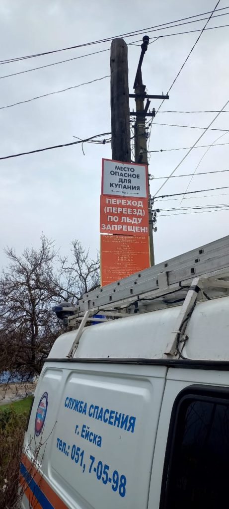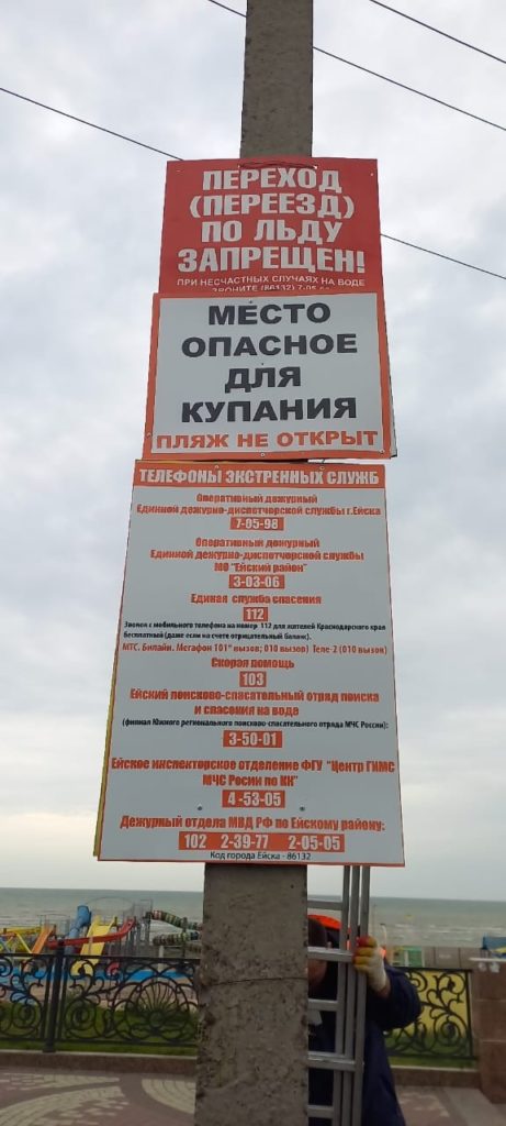 Поэтому Служба спасения г. Ейска установили таблички на некоторых участках берега, чтобы предупредить об опасности. На них также можно узнать номера экстренных служб.