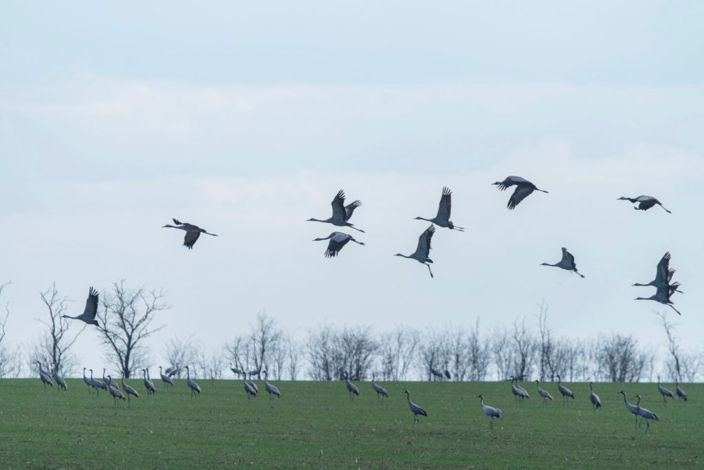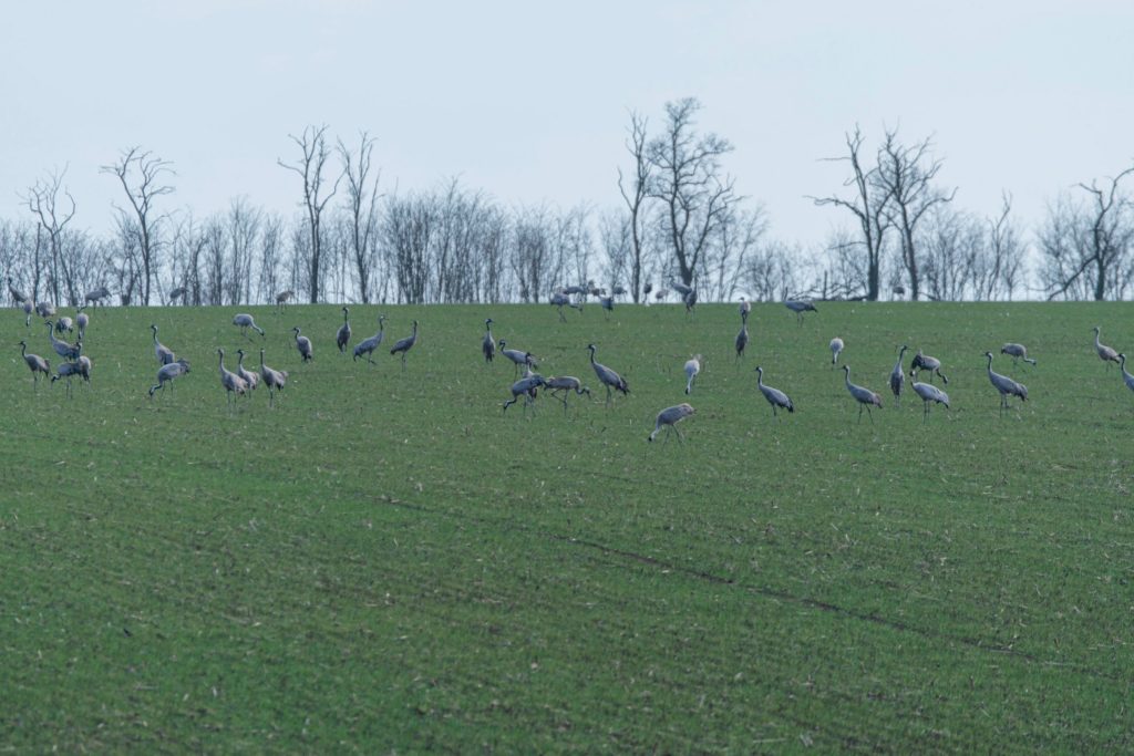 Такую картину на местных полях заметили вчера. Сейчас серые журавли кормятся. Долго они здесь не задержатся, вскоре улетят к месту своего обитания.