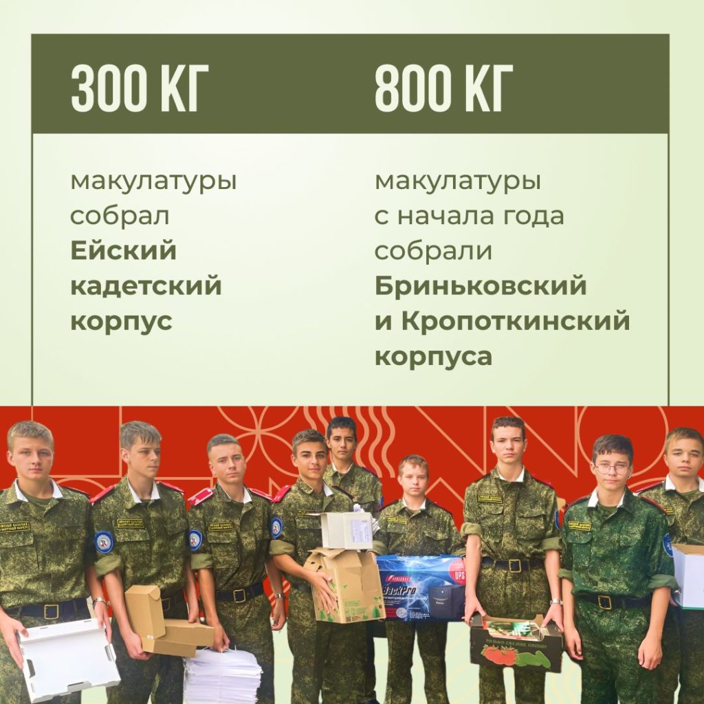 Сотрудники и кадеты корпуса собрали для сдачи в пункты приёма г. Ейска более 1 тонны макулатуры. А чтобы подрастающее поколение более глубоко узнало об экологических проблемах, были проведены экоуроки и лекции на тему раздельного сбора отходов и переработки.