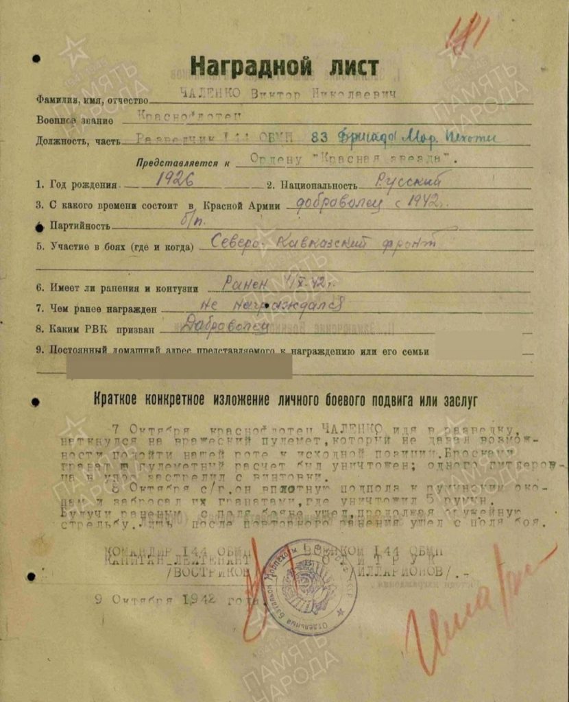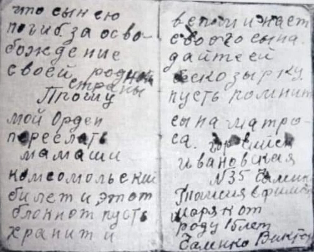 В кармане его гимнастёрки нашли блокнот. Там было записано: «Счёт фронта: пулемётов 2, фрицев 14, танк 1… Если погибну, прошу зайти ко мне домой в г.Ейск и рассказать моей старушке, что её сын погиб за освобождение своей родной Отчизны…Дайте бескозырку ей… Моряк от роду 15 лет Чаленко Виктор”.