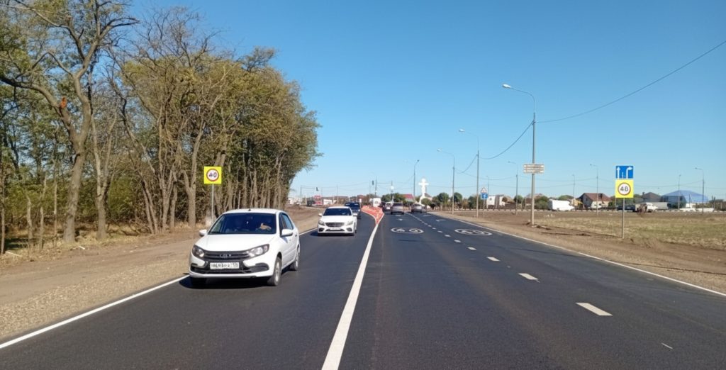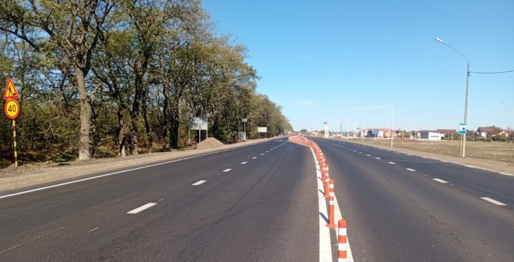Сейчас на участке, соединяющем Ейск со станицами Ясенской, Копанской и Новоминской, специалисты занимаются установкой автопавильонов и планировкой присыпных берм — это уступ на наклонном склоне насыпи, созданная для повышения устойчивости склона, улучшения водоотвода и обеспечения места для установки знаков или другого оборудования.