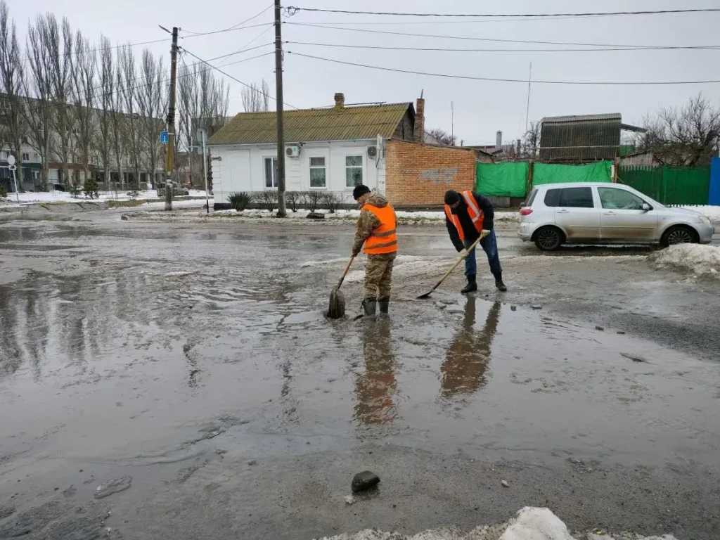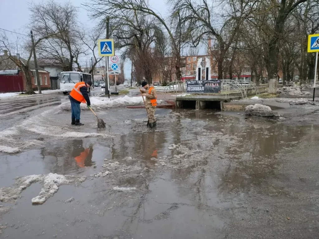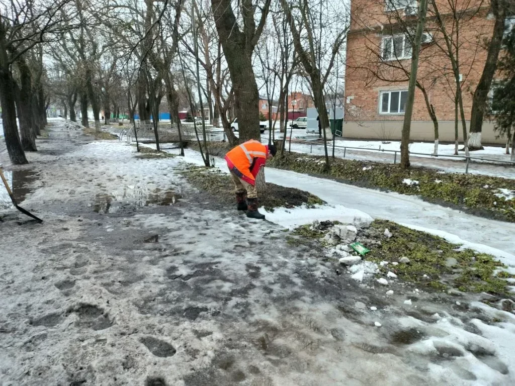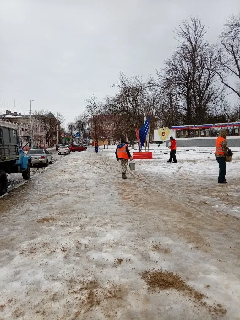 Сейчас коммунальщики чистят от снега и наледи городские общественные территории и улицы и посыпают тонкий слой мокрого льда песком.
