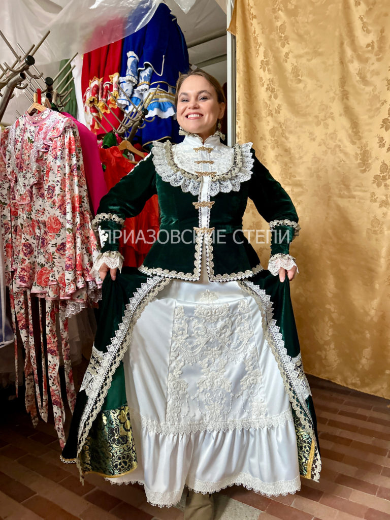 Но не тут-то было. Быстро окинув меня профессиональным взглядом, из недр костюмерной она вынесла сногсшибательное платье. Для меня, человека, далёкого от тонкостей швейного мастерства и истории моды, это платье показалось приветом из эпохи придворных дам: бархат глубокого изумрудного цвета, атласная юбка с золотым шитьём и пуговицы в виде драгоценных камней.