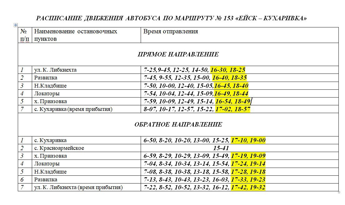 Общество 29 августа 2025 С 1 сентября изменится расписание движения автобуса Ейск-КухаривкаЭто муниципальный пригородный маршрут № 153. При планировании поездок, учитывайте изменения в графике маршрута. Ознакомиться с обновленным расписанием можно на фото снизу.