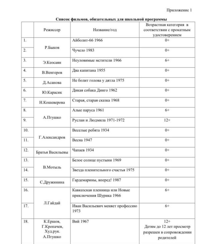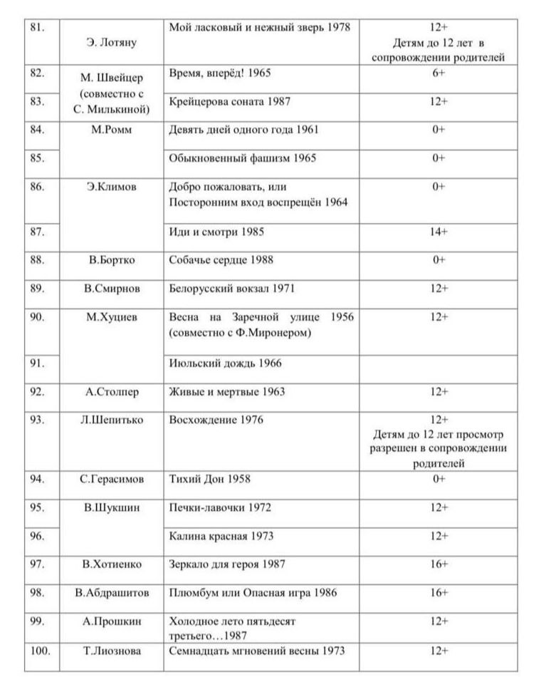 Всего список включает около ста фильмов, охватывающих разные жанры и эпохи. Ленты имеют возрастные ограничения от 0+до 16+.