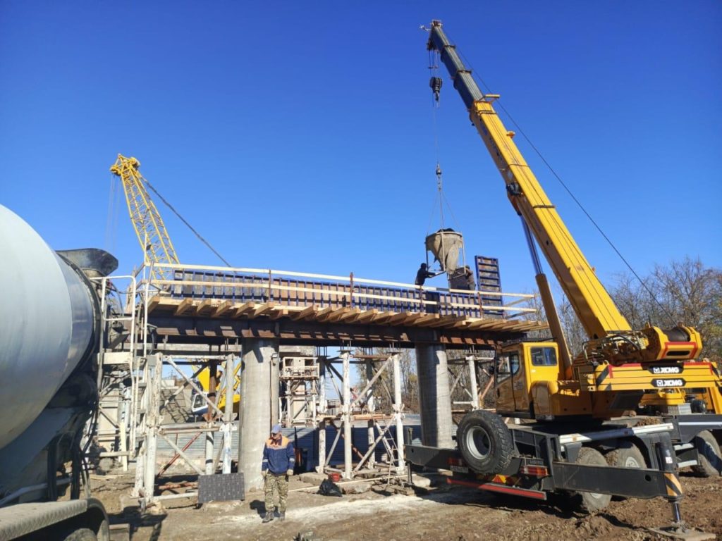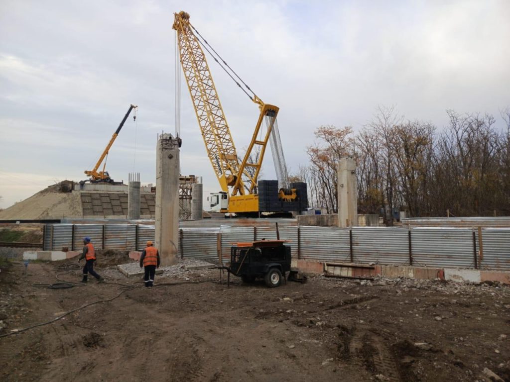 Уже завершена установка монолитной шкафной стенки с открылками на первой и четвертой опорах, устройство накаточного рельсового пути для сборки и надвижки металлического пролетного строения.