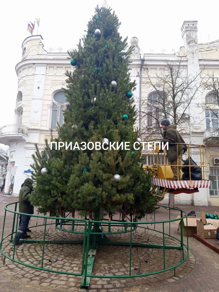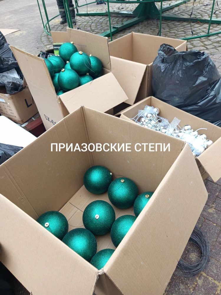 10-метровые гирлянды белого и зелёного цветов повесили первыми. Верхушку ёлки украшает пятиконечная звезда, которая будет светиться красным цветом.