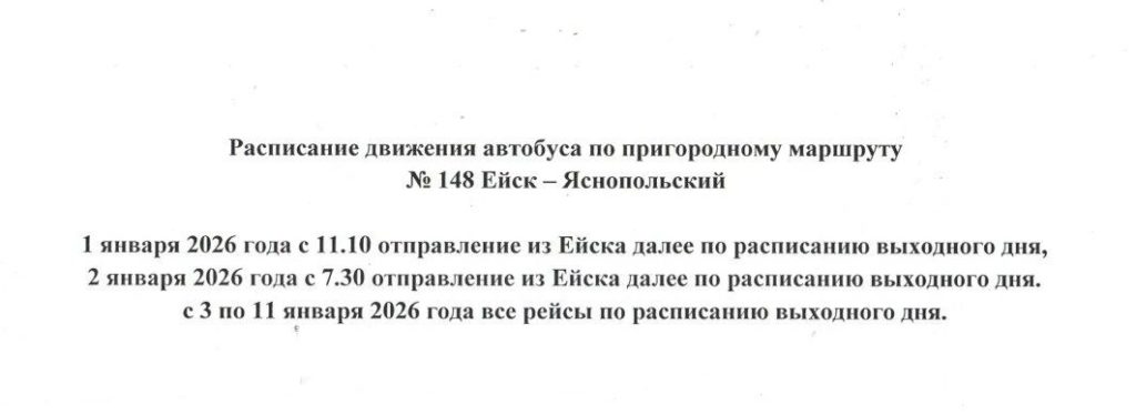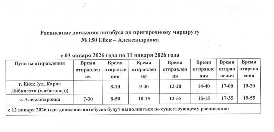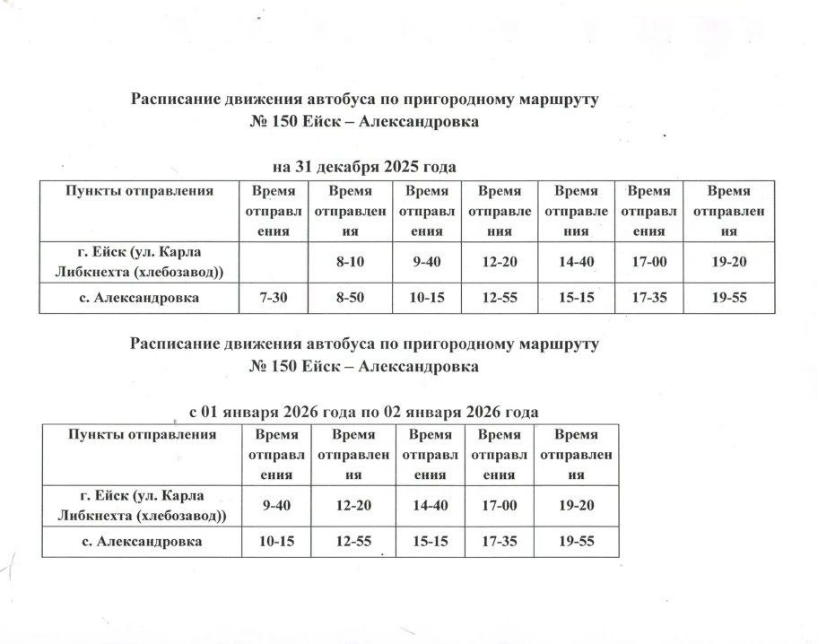 Расписание движения автобуса по маршруту № 150 Ейск – с. Александровка,
