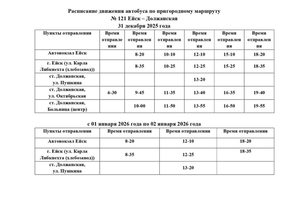 Расписание движения автобуса по маршруту Nº 121 Ейск — Должанская