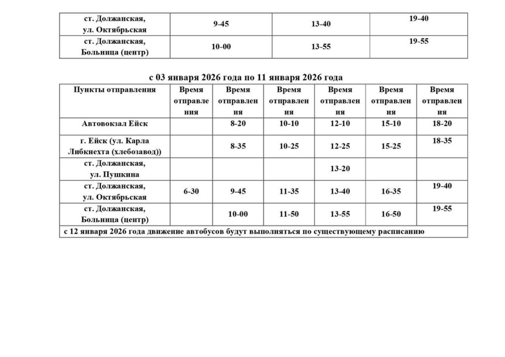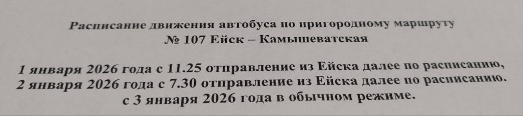 Расписание движения автобуса по маршруту №107 Ейск – Камышеватская