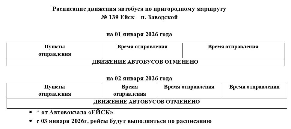 Расписание движения автобуса по маршруту №139 Ейск-п. Заводской