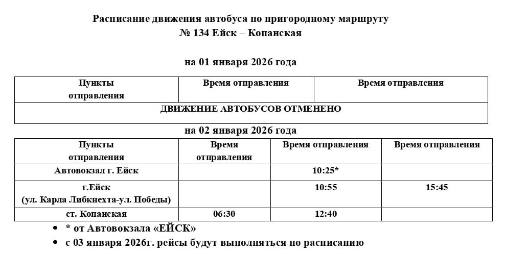 Расписание движения автобуса по маршруту №134 Ейск-Копанская