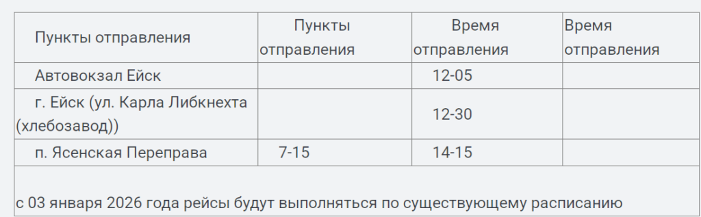 Расписание движения автобуса по маршруту № 133А Ейск –Ясенская Переправа.