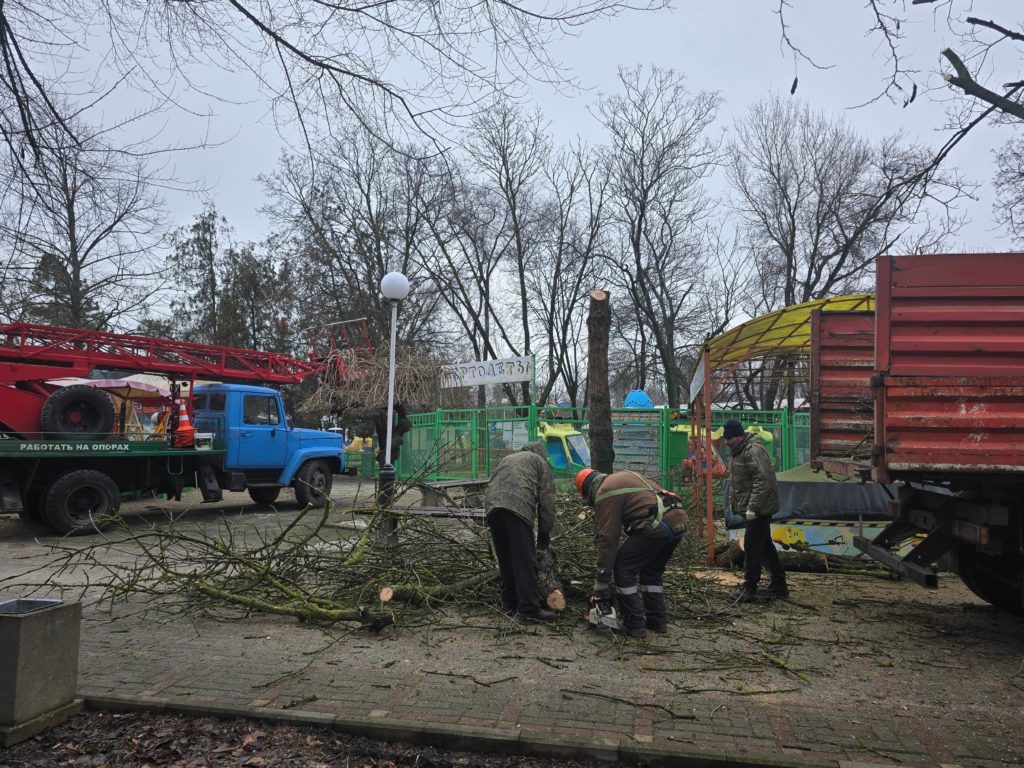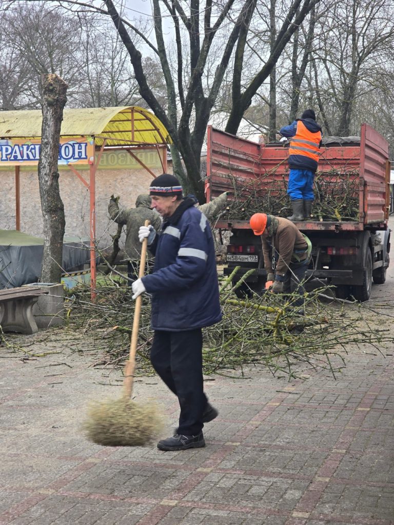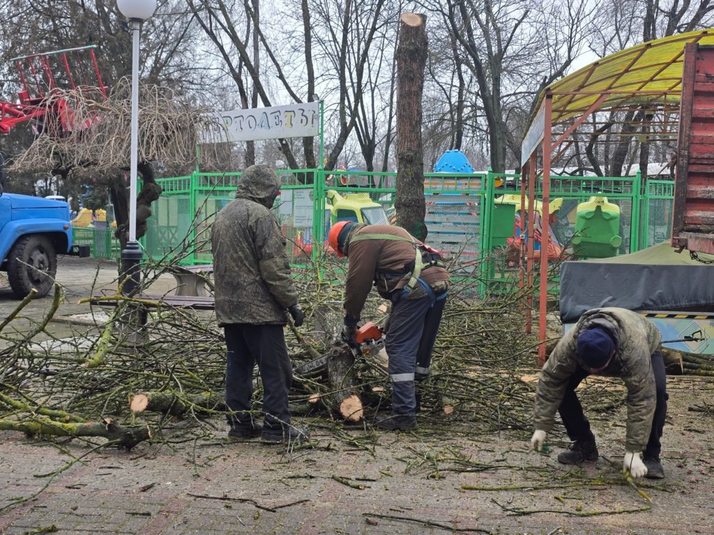 Сотрудники убирают территорию и продолжают обрезку деревьев.
