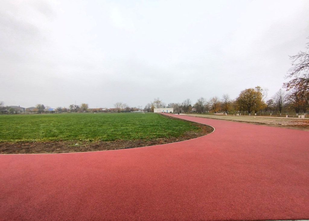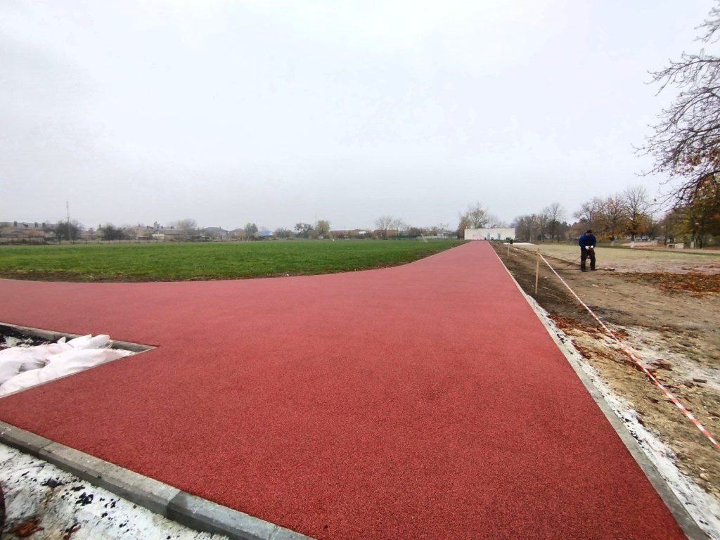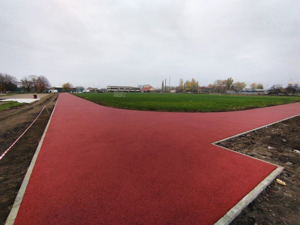 На стадионе полностью готово основание из резинового покрытия на беговых дорожках.