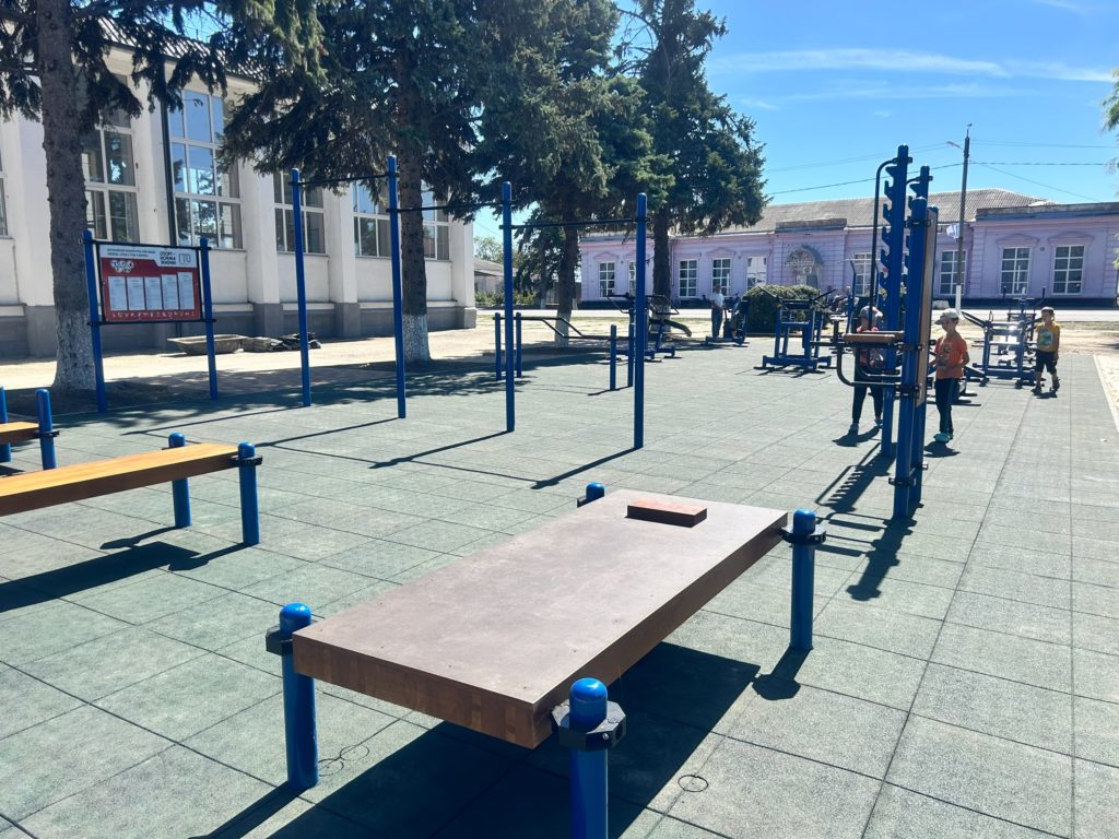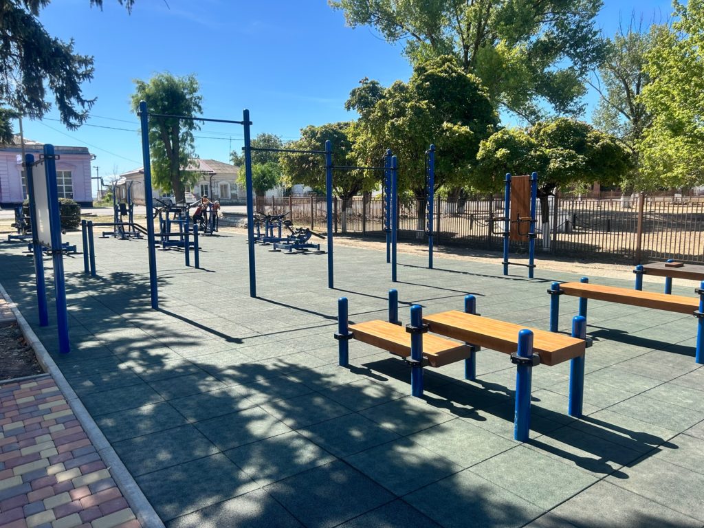 Площадка оснащена всем необходимым оборудованием для выполнения норм ГТО, оборудована новыми турниками и тренажёрами, гимнастическими скамьями и перекладинами. На площадке уложено травмобезопасное резиновое покрытие.